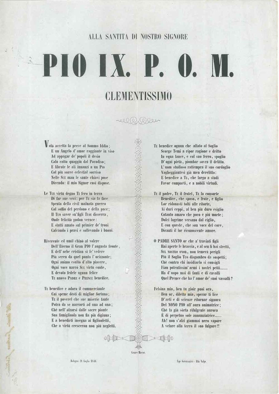 Dedica di Masini a Gaetano Giordani al retro di un foglio sciolto azzurrino con stampata una ode "Alla Santità di Nostro Signore Pio IX"