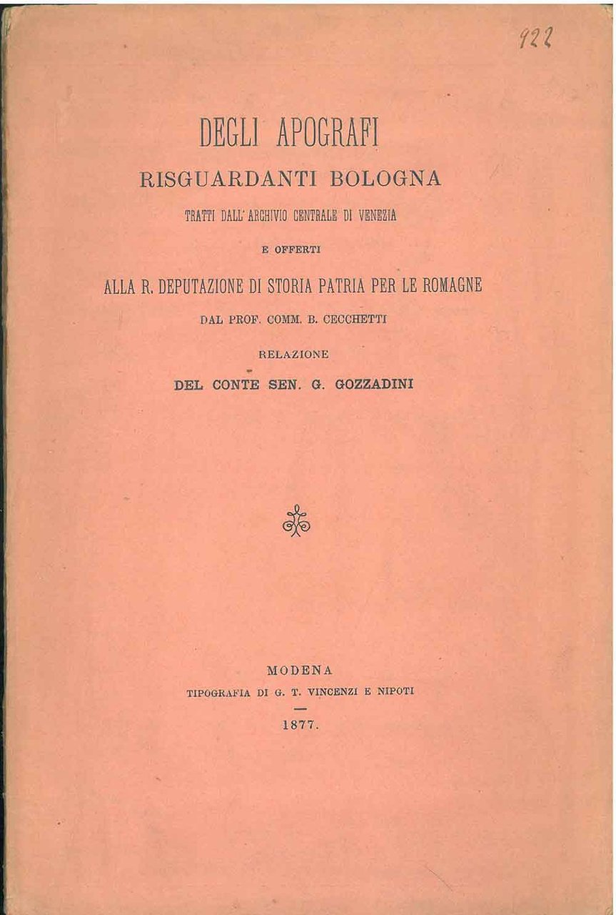 Degli apografi risguardanti Bologna tratti dall'archivio centrale di Venezia