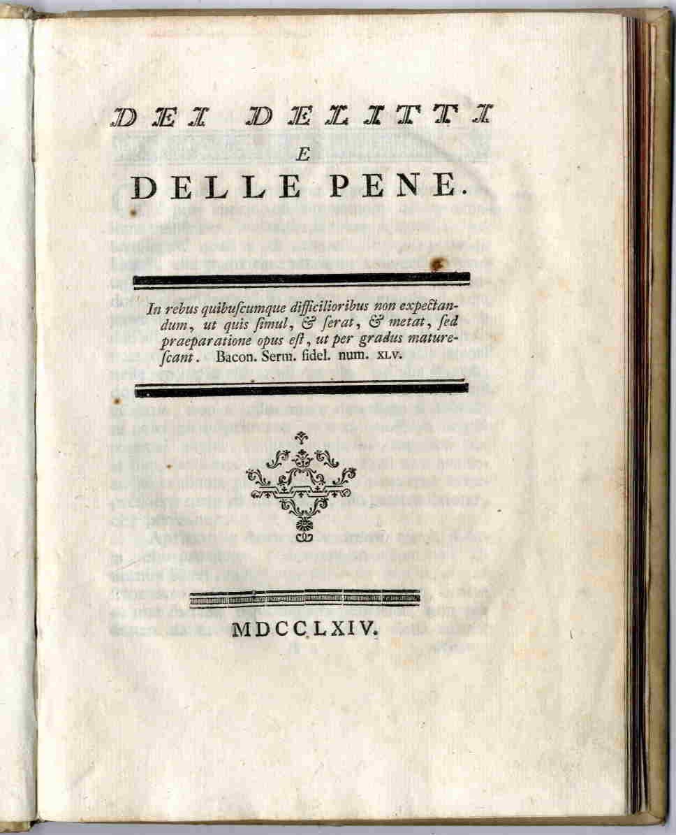 >in-4 (204x150 mm), pp. 104 (privo del foglio d'errata aggiunto in alcuni esemplari), legatura coeva in pergamena rigida. Edizione originale di una delle più importanti opere nella storia del pensiero moderno, vera e propria pietra miliare nel campo della legislazione ed uno dei testi che influenzarono la ''Dichiarazione dei diritti dell'uomo''. Il trattato del filosofo e giurista milanese (1738-1794) ebbe uno straordinario successo nel secolo dei lumi, dovuto all'opportunità della maggior parte delle riforme auspicate, parecchie delle quali furono in effetti, e con successo, adottate. L'opera di Beccaria ebbe in edizioni successive il commento di Diderot e di Voltaire, e fu conosciuta ed ammirata da uomini come d'Alembert, Helvétius, Holbach, Hume e Hegel. La sua efficacia fu grande nel campo della pratica, poiché del suo influsso risentì più o meno profondamente la nuova legislazione penale di tutti i prìncipi riformatori. “Beccaria maintained that the gravity of the crime should be measured by its injury to society and that the penalties should be related to this. The prevention of the crime he held to be of greater importance than its punishment, and the certainty of punishment of greater effect than its severity. [His] ideas have now become so commonplace that it is difficult to appreciate their revolutionary impact at the time.” (PMM). E' sicuramente una tra le opere più innovative e rivoluzionarie sulla riforma penale e la criminologia, in opposizione alla pena di morte, in perfetta sintonia con le idee umanitarie dell'Illuminismo europeo. Esemplare non pressato, a grandi margini e fresco (da due a cinque puntini di ossidazione su qualche foglio). Printing and the Mind of Man 209. Firpo I, p. 539, 1. Cat. Einaudi 3362. Govi, Classici: ''rare copies have an extra leaf at the end containing an errata with 21 corrections''. A. Caso, America’s Italian Founding Fathers, Boston, 1975. Harcourt, Becarria’s On Crimes and Punishments. A Mirror on the History of the Foundations of Modern Criminal Law, Chicago, 2013. Hostettler, C.Beccaria. The Genius of ‘On Crimes and Punishments’, 2011.