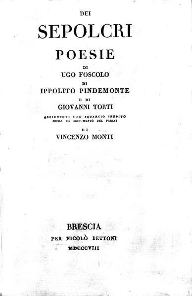 In-8 p. (mm. 215x130), mz. pelle mod., filetti e titolo oro al dorso, piatti in cartonato coevo, VIII,76 pp.num., 2 cc.nn. (una con Edizione protetta dalla legge 19 fiorile anno IX e una c.b.). Vi sono contenuti: "Dei sepolcri", carme di Foscolo, in terza edizione - "I sepolcri", versi di Pindemonte, in seconda edizione - "Sui sepolcri" di Foscolo e di Pindemonte. Epistola di Torti, in prima edizione - Versi del Monti (estratti dal V canto inedito della Mascheroniana), in prima edizione.Cfr. Mazzolà,30 - Ottolini,154: fu ristampato nel 1823 e 1824 - Manca all'Acchiappati.Restauro al frontespizio per picc. strappo margin., alc. pagine con aloni ma certamente un buon esemplare su carta forte.