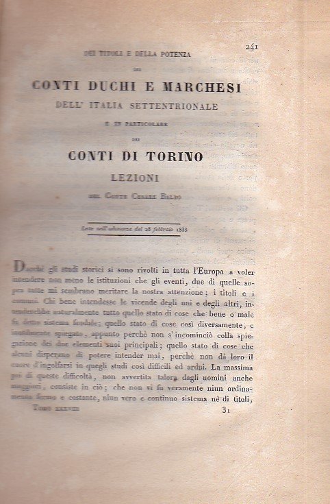 Dei titoli e della potenza dei Conti Duchi e Marchesi dell' Italia Settentrionale e in particolare dei Conti di Torino. Lezioni lette nell' adunanza del 28 febbraio 1833