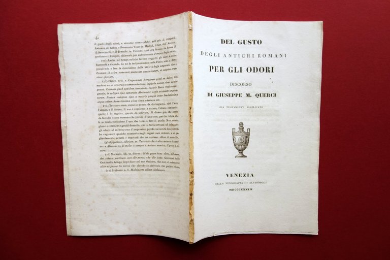 Giuseppe G. Querci, del Gusto degli antichi Romani per gli odori discorso di Giuseppe M. Querci ora nuovamente pubblicato Dalla Tip. di Alvisopoli, Venezia 1833; cm 21,5x14; pp. 40; mancanza della legatura e dell'antiporta, testo completo. Condizioni di conservazione Esemplare in condizioni pi√π che discrete con tracce d'uso, mancante della legatura e dell'antiporta ma compatto grazie a tracce della precedente legatura al dorso (vedi foto); margini superiore e inferiore lievemente rifilati. Minime fioriture. Molto interessante e notevolmente raro. Mancante dell'antiporta ma testo completo. Da rilegare. SC03.D17021 N