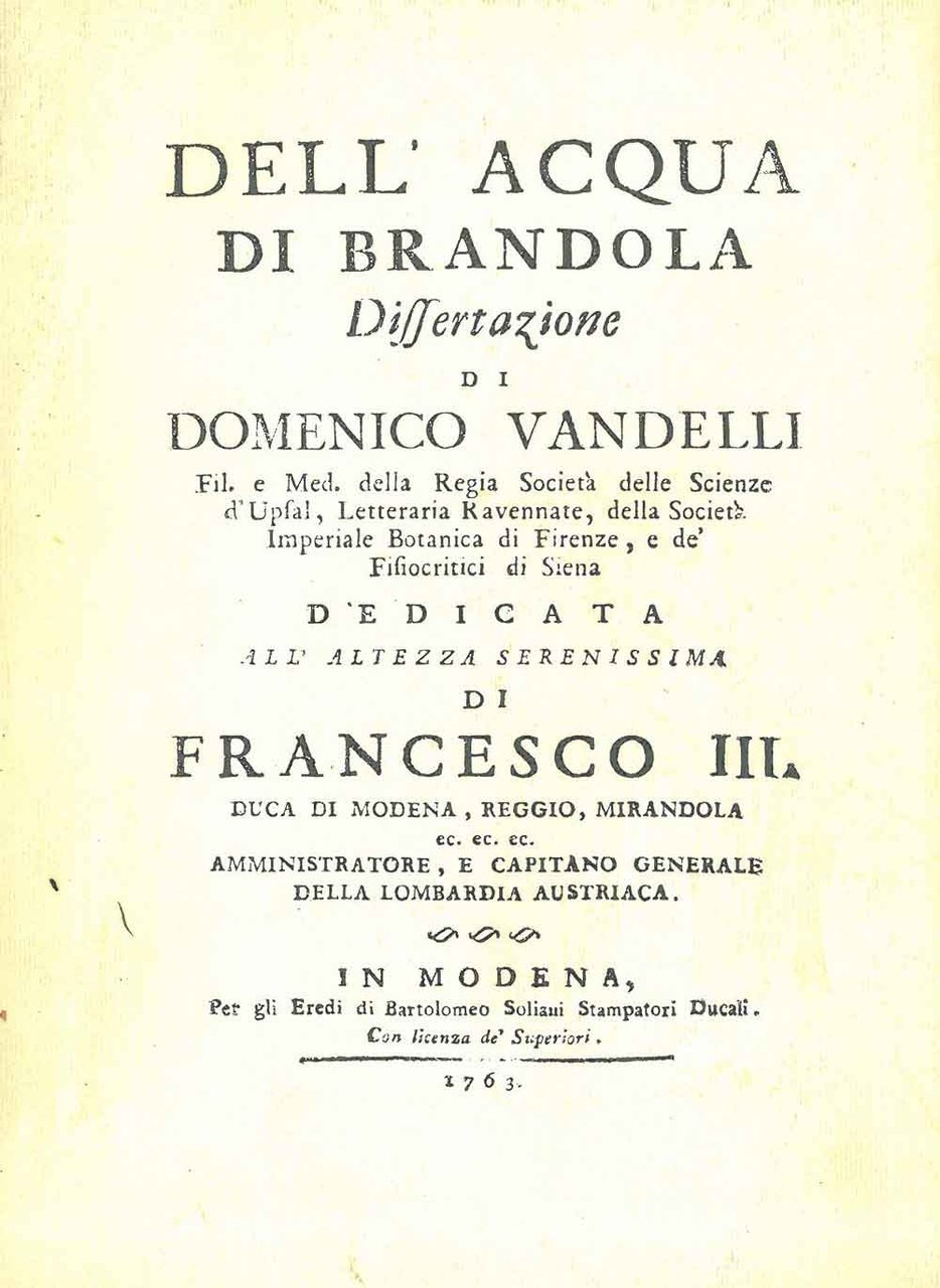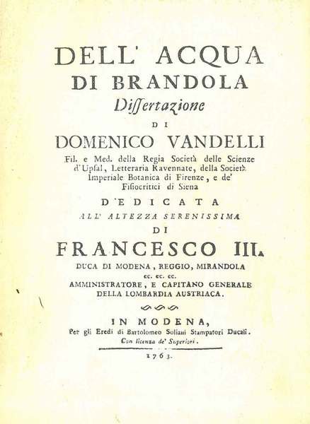 Dell'Acqua di Brandola. Dissertazione di Domenico Vandelli. Modena, Soliani, 1763, ma