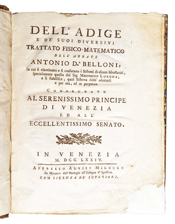 Dell'Adige e de' suoi diversivi trattato fisico-matematico dell'abbate Antonio D. Belloni, in cui si esaminano e si confutano i sistemi di alcuni idrostatici, specialmente quello del Sig. matematico Lorgna; e si stabilisce, qual sistema debb'adottarsi e per ora, ed in perpetuo. Consecrato al serenissimo Principe di Venezia ed all'eccellentissimo Senato. | Libros antiguos y modernos | Belloni, Antonio