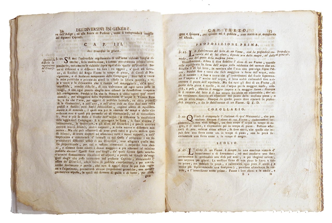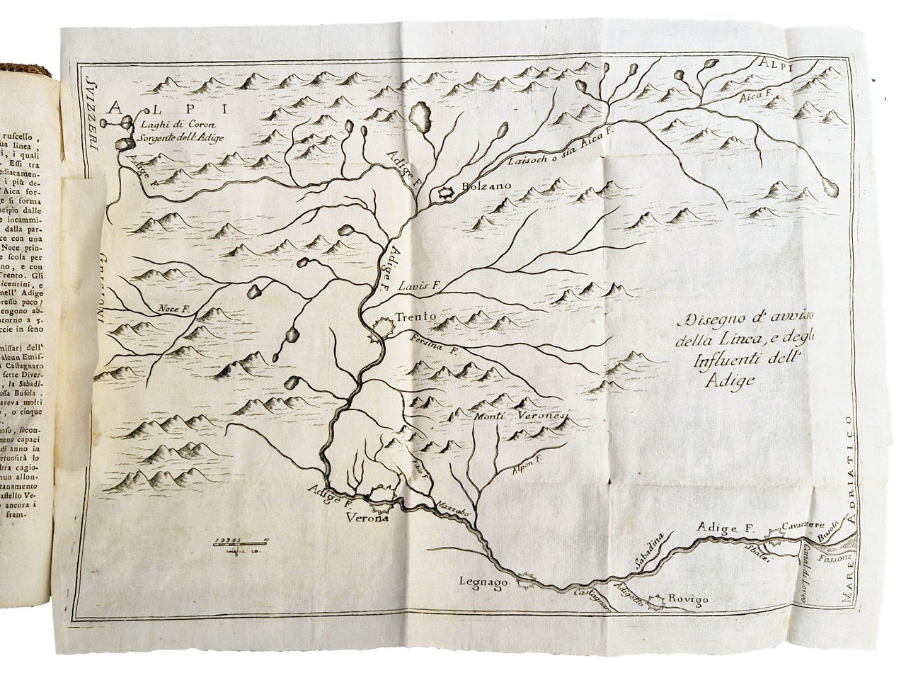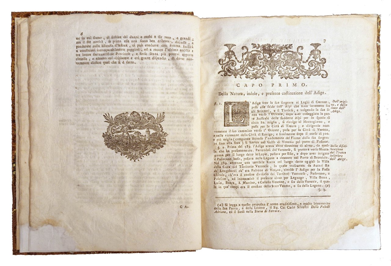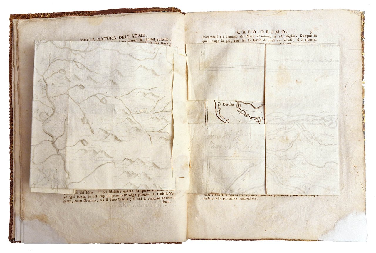in-4°, 246x190 mm, leg. in cartonato rigido ricoperto in carta marmorizzata; pp. XII, 132, [2] c. di tav. ripiegate. Fregio xilografico sul frontespizio. Iniziali e fregi xilografici; carte geografiche calcografiche. Le due tavole, più volte ripiegate, rappresentano il "Disegno d'avviso della linea e degli influenti dell'Adige", dalle sorgenti alla foce in Adriatico, e la "Topografia d'avviso delle acque del Polesine". Interessante prima edizione di quest'opera di idrologia sul corso del fiume Adige e dei suoi affluenti, a cura di Antonio Belloni (1736-1782), teologo e matematico. Rif.: IT\ICCU\SBLE\001086. OCLC, 889590587. Cond.: Legatura in perfette condizioni. Restauro alll'angolo inferiore delle prime 25 carte circa (fino a p. 39). Carte pulite, morbide, in barbe. Buon esemplare. -- INTERESTING FIRST EDITION OF THIS HYDROLOGICAL TREATISE ON THE COURSE OF THE ADIGE RIVER AND ITS TRIBUTARIES, edited by Antonio Belloni; the text is accompanied by two tables, folded several times, representing the "Drawing of the line and the influents of the Adige", from the sources to the mouth in the Adriatic, and the "Topography of the Polesine waters". Good copy.