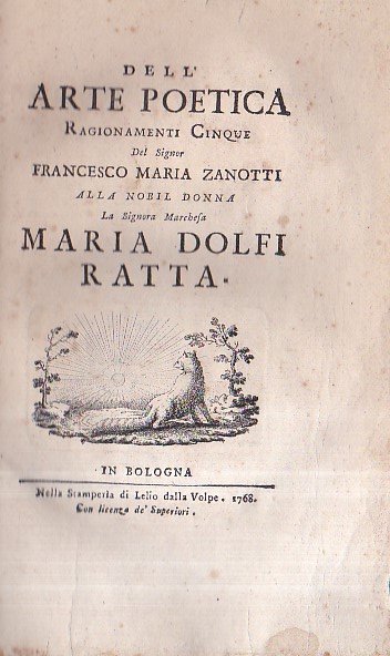 In-8° (215x140mm), pp. XII, 401, (1), cartonatura azzurra coeva con titolo manoscritto su tassello cartaceo al dorso. Impresa dei dalla Volpe incisa al frontespizio. Dedicatoria alla marchesa Maria Dolfi Ratta. Normali fioriture. Bella copia in barbe. Prima edizione di questo trattato settecentesco volto a stabilire le caratteristiche estetiche e retoriche dei vari generi letterari, dalla poesia lirica a quella epica, dalla tragedia alla commedia. Il volume fu altamente apprezzato dal Parini, che ebbe a dichiarare: 'nulla v'ha di simile fra le Poetiche moderne'. E il Gamba: 'Il Parini commendava di questo libro singolarmente la profondità delle dottrine unita all' eleganza, alla grazia, alla venustà ed alla facilità dello stile; e soleva dire, che nulla v'ha di simile fra le Poetiche moderne, e che va del pari con le Poetiche d'Orazio e d'Aristotele'. Lo Zanotti (Bologna, 1692-ivi, 1777), zio dello scienziato Eustachio, fu fisico, filosofo e letterato che cercò ingegnosamente, nel libro Della forza attrattiva delle idee, di applicare la legge d'attrazione newtoniana alle idee e, in altri saggi, di coniugare l'aristotelismo con i nuovi ritrovati della fisica di Newton e della filosofia di Cartesio. Gamba, 2514. Canterzani, Annali dalla Volpe, p. 246, n. 4: 'Edizione originale e non comune. si commendano e per l'eleganza dello stile, come per la solidità dei precetti illustrati dagli esempi'.
