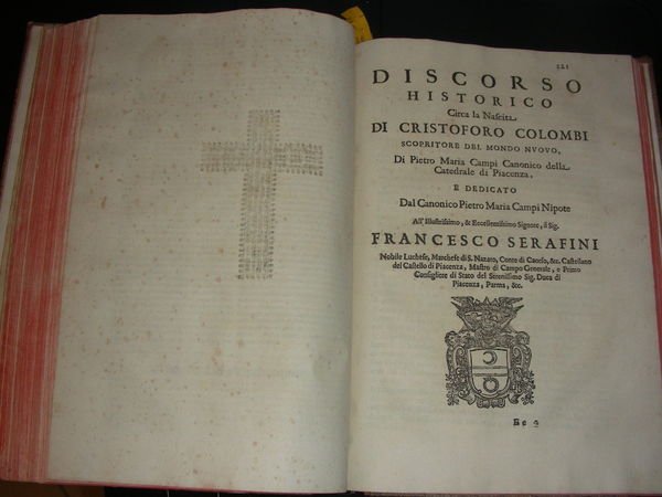 DELL’HISTORIA ECCLESIASTICA DI PIACENZA di. Nella quale si spiegano le attioni de’ Santi, Beati e Vescovi della sudetta città, l’antichissima immunità e giurisdittione dell’istessa Chiesa con le fondationi di molti luoghi sacri, le varie donationi e gratie riportate da Sommi Pontefici, Imperadori, Re e Principi. Si fà mentione di molte famiglie, huomini illustri, e maggiori successi. Si racconta l’origine de’ nomi de’ villaggi, terre, e castella sì del Piacentino, come di Stati forestieri. E nel fine l’Historia vera circa l’origine, e nascita di Cristoforo Colombo piacentino scopritore del Nuovo Mondo.