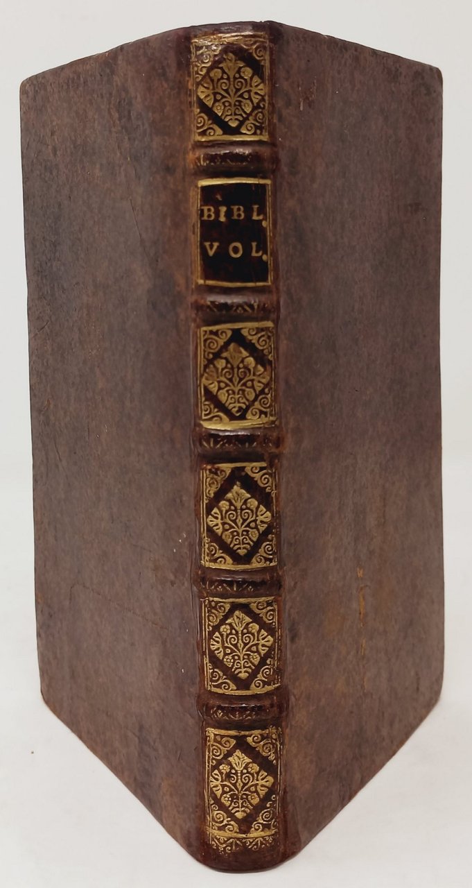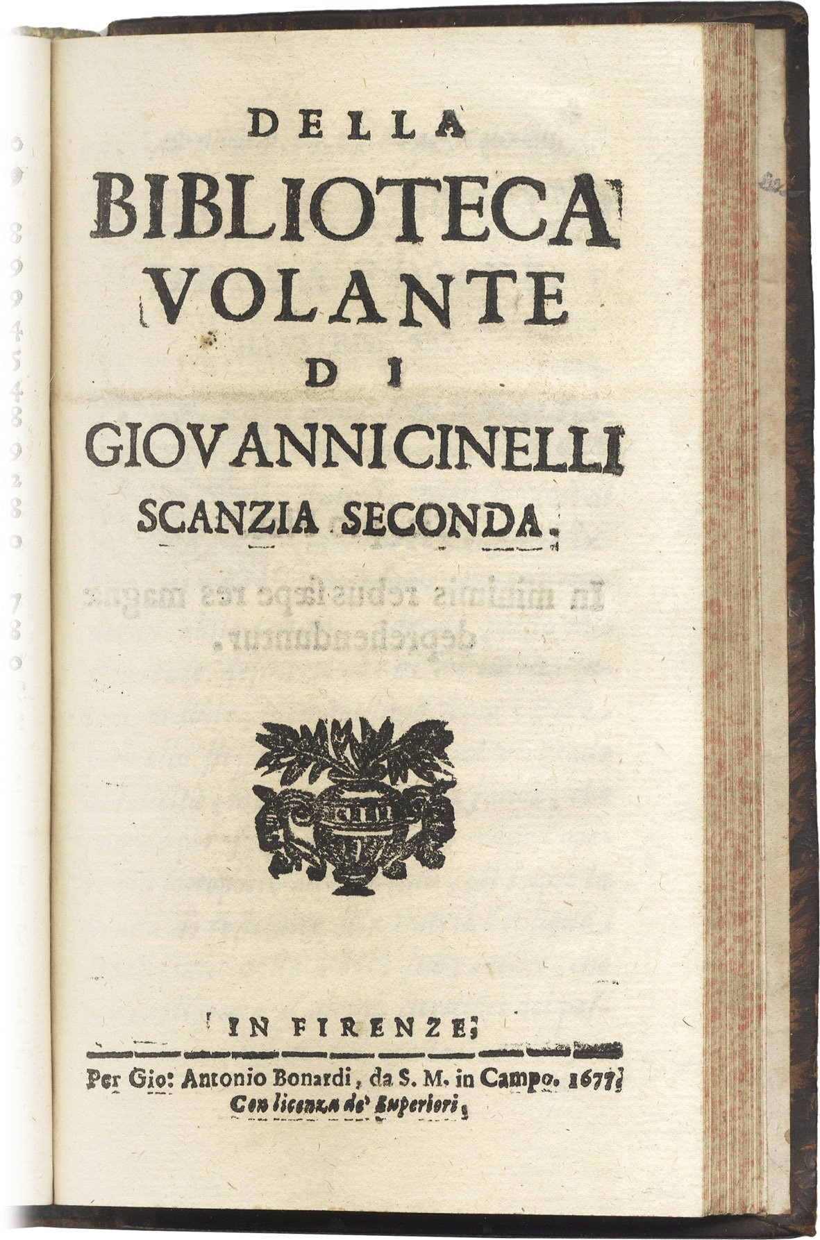 >2 parti in 1 vol. in-8, pp. 96; 112, legatura coeva in p. pelle, tit. e fregi in oro al dorso. Fregetti ai titoli e iniziali xilogr. decorate. Prima rara edizione dei primi due volumi della Biblioteca Volante; di quest'opera del Cinelli (1625-1706), medico e bibliografo amico del celebre bibliotecario Antonio Magliabecchi, apparvero 23 Scansie, rarissime, tutte impresse in-8. Curioso e importante catalogo disposto in ordine alfabetico e corredato di indici in cui l'autore offre informazioni su edizioni, opuscoli rari, fogli volanti (da cui la ''Biblioteca Volante'' del titolo) e personaggi, soprattutto fiorentini, della sua epoca ''nella stessa forma che familiarmente ed estemporaneamente favello''. Dopo queste prime due di Firenze, che Cinelli dovette abbandonare osteggiato da alcuni nobili della città offesi dai suoi sarcasmi, le altre Scansie uscirono irregolarmente in varie città d'Italia. Provenienza: Franciscus Martin, teologo parigino (1717). Ottimo esemplare, fresco e a grandi margini. Importante documento per la bibliografia antica. Brunet II, 70: ''Ces notices d'opuscoles de tous genres forment un recueil intéressant pour les bibliographes''. Gamba 1880: ''oggidì assai rare''. Michel-Michel II, 105. Graesse II, 187-188. DBI XXV, 583-589.