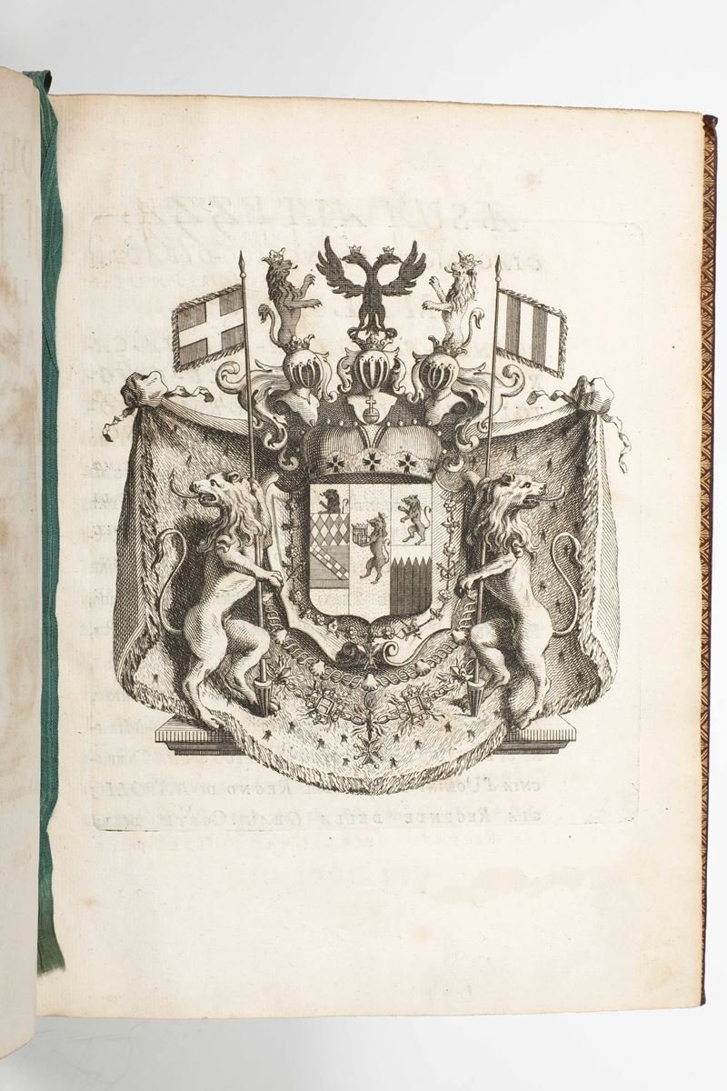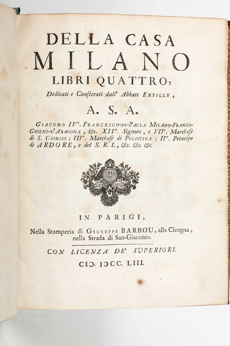 >In-4 (mm250x190), pp. XXXIV, 458, (2 b), grande stemma inciso in rame a piena pagina relativo alla famiglia Milano. Bella legatura in pieno marocchino rosso foncé, realizzata da Derome le Jeune, come si evince dall'etichetta applicata alla prima carta di sguardia ("rue St Jacques au dessus de St Benoist"). Piatti incorniciati da triplice filetto, fiori accantonati, al centro dei piatti sono riprodotte le armi della famiglia Milano. Ricchi fregi negli scomparti e titolo oro su tassello al dorso a cinque nervi, tagli dorati dentelles interne. Jean-Joseph Expilly (1719 - 1793) fu un ecclesiastico francese e autore di diverse opere storiche, geografiche e statistiche. Parlando e scrivendo in italiano, fu segretario dell'ambasciatore del re di Sicilia negli ultimi tre anni dell'ambasciata del principe d'Ardore, Jacques-François-de-Paule Milano, cui è dedicata questa genealogia della sua famiglia.