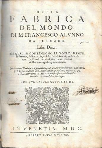 Della Fabrica del Mondo di M. F. A. da Ferrara, Libri Dieci. Ne' quali si contengono le voci di Dante, del Petrarca, del Boccaccio, & d'altri buoni Autthori, mediante le quali si possono scrivendo esprimere tutti i concetti dell'huomo di qualunque cosa creata. Con un nuovo vocabulario in fine. aggiunto da M. Thomaso Porcacchi