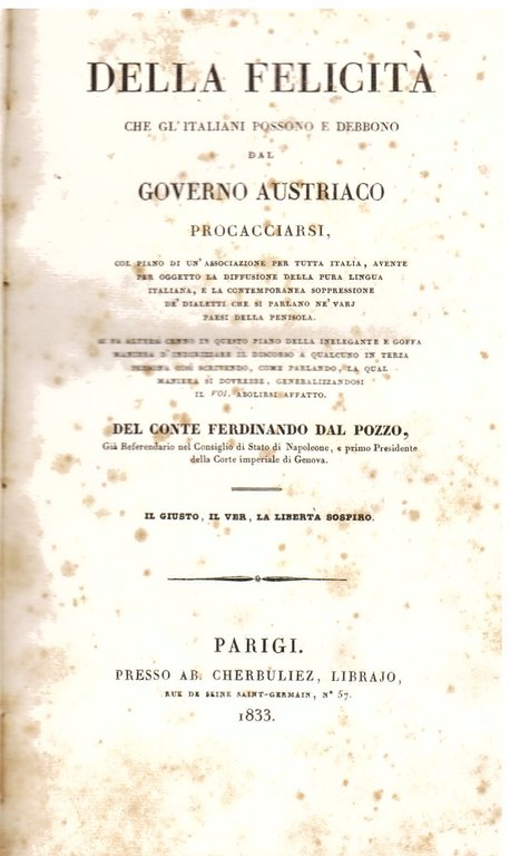 Della felicità che gl' Italiani possono e debbono dal Governo Austriaco procacciarsi, col piano di un' associazione per tutta Italia, avente per oggetto la diffusione della pura lingua italiana, e la contemporanea soppressione de' dialetti che si parlano ne' varj paesi della penisola. Si fa altresì cenno. della inelegante e goffa maniera d' indirizzare il discorso a qualcuno in terza persona così scrivendo, come parlando, la qual maniera si dovrebbe, generalizzandosi il Voi, abolirsi affatto
