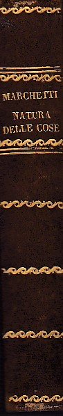 In-8° (205x130mm), pp. XXXVII, 455, legatura ottocentesca m. pelle marrone con titolo e decori in oro al dorso. Punte in pergamena, piatti marmorizzati. Frontespizio inciso su rame dal Capocchi 'con fine stile settecentesco' (Vinciana), con titolo entro bordura istoriata con putti, rocailles e figure allegoriche. Ritratto del Marchetti inciso su rame sempre dal Capocchi all'antiporta entro cornice. Dedicatoria a Caterina di Russia. Vari errori di numerazione (pp. 239-240 ripetute; pp. 335-336 omesse; p. 417-431 numerate erroneamente 433-448). Bruniture sparse. Bell'esemplare. Rara edizione della versione del Marchetti del 'De Rerum Natura' (pubblicata all'origine a Londra nel 1717), impressa probabilmente a Venezia senza indicazioni tipografiche; si tratta, al dire della ricostruzione cronologica della Vinciana, della settima edizione assoluta della traduzione del Marchetti. Precedono versi italiani e latini di autori vari (Basilio Giannelli, Lorenzo Adriani, Giorgio Flemingh, Maria Selvaggia Borghini, etc). Il Marchetti (Pontormo, 1633-Pisa, 1714) fu assai stimato sia come scienziato (fu fra gli allievi più brillanti di Galileo e autore di opere aritmetiche in latino) che come letterato e poeta. Traduttore anche di Anacreonte, lasciò tuttavia affidato il suo nome a questa classica e insuperata versione di uno dei grandi capilavori della poesia classica, compiuta fra il 1664 e il 1669 e circolata manoscritta sino al 1717 in quanto ritenuta empia dalle autorità ecclesiastiche per la diffusione stessa delle idee epicuree e materialistiche di Lucrezio. Gamba, 1973: 'E' probabilmente fatta in Venezia, ed ha a' luoghi loro aggiunte Varie Lezioni tratte da un ms. autografo'. Vinciana, 2792: 'Prima edizione critica assai pregiata'. Graesse, IV, p. 290. Razzolini, p. 205.