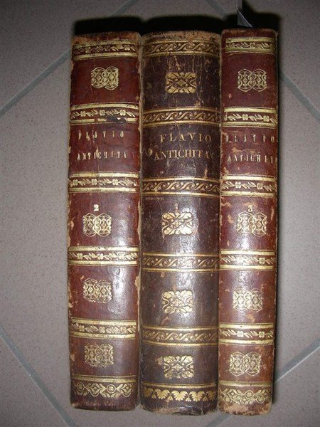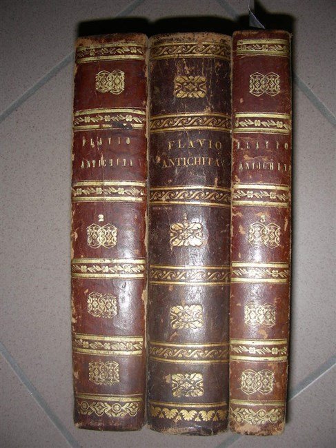 3 gr. voll. in-4, pp. XV, 783; 806; 564, leg. m. pelle coeva con piatti in carta dec. Tagli color. Importante edizione del Flavio con accurate note di commento, illustrata da diverse ill. xilogr. Bella edizione figurata della cronistoria dalla creazione del mondo fino all’epoca di Nerone. Narrazione fedele al testo originale di Francesco Angiolini (Piacenza 1750 - Polock, Russia, 1788) fu letterato e traduttore di classici: la sua versione di Giuseppe Flavio dal greco all’italiano fu tanto apprezzata da pubblicarne ben 7 edizioni. Minimi dif. alla carta della leg. con alcune spellature. [012]
