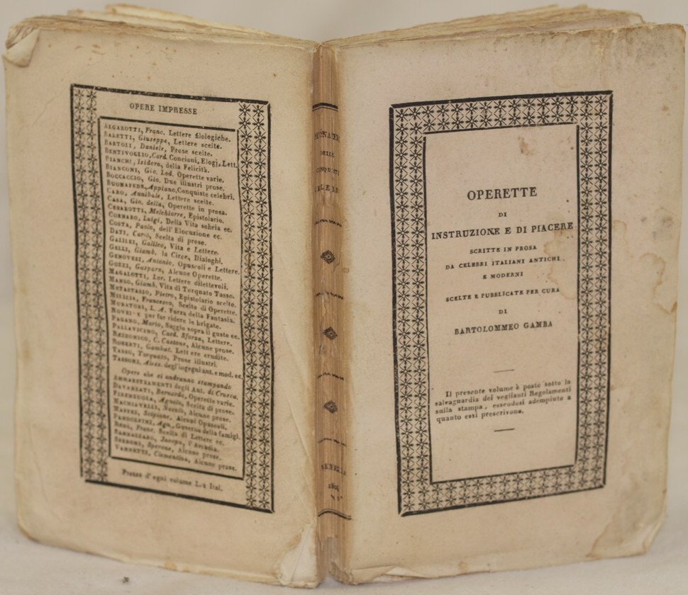 In 16. Dim. 17x11 cm. Pp. IX+(2)+204+(2). Edizione del 1824 di questa opera del filosofo italiano Appiano Buonafede (1716-1793) nato a Comacchio (Ferrara) che pubblicò sotto lo pseudonimo di Agatopisto Cromaziano. Nella prima parte notizia sulla vita e opere di Appiano Buonafede. All'interno: Tommaso Hobbes, Niccolo Machiavelli, Montesquieu, Samuele Coccejo, John Locke, Conquiste dei babilonesi e assiri, Conquistedegli egiziani, dei Medi e dei Persiani, Macedoni, Cartaginesi, Romani, Collegio dei Feciali, Incursione dei galli, Romani ingiusti contro i sanniti e tarantini Cinea, Dione Timoleonte e dionisii ecc. Ritratto in antiporta. In barbe. In buone condizioni. Copertina editoriale in buone condizioni generali con lievi usure ai margini e dorso. Legatura in buone condizioni. All'interno le pagine si presentano in buone condizioni con fioriture. Alcune lievi gore d'umidità. Edition of 1824 of this work by the italian phylosopher Appiano Buonafede (1716-1793) born in Comacchio (Ferrara) who published under the pseudonymous of Agatopisto Cromaziano. In the first part information about life and works of Appiano Buonafede. Inside: Tommaso Hobbes, Niccolo Machiavelli, Montesquieu, Samuele Coccejo, John Locke, Conquers of babilonesi and assiri, Conquers of egyptians, Mediands and persians, Macedoni, Cartaginesi, Romans, College of Feciali, battle of gallians, Romans against sanniti and tarantini Cinea, Dione Timoleonte and dionisii etc. Portrait n the frontspice. Uncut copy. In good conditions. Editorial cover in good general conditions slightly worn in the edges and spine. Binding in good conditions. Inside pages are in good conditions with foxings. Some slight humidity stains in the edges.