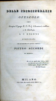 Delle idiosincrasie. Opuscolo che auspice l'Egregio P. O. Prof. d'Anatomia sublime e di Fisiologia A. C. Rigoni pubblicava in occasione di laurea medica Pietro Accordi da Mantova