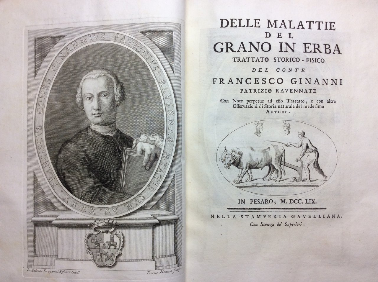 In-4 p. (mm. 286x202), cartonato muto coevo, tit. ms. al dorso, pp. XVIII,426,(2 di Correzioni), vignetta ovale incisa al frontespizio, testo ornato da belle testate, grandi capilettera figur. e finali inc. in rame, tutto a soggetto agreste, con 4 tabelle ripieg. fuori testo Il volume è molto ben illustrato da: 1 ritratto dell'autore in antiporta, inciso da Pietro Monaco su disegno di Giovanni Andrea Lazzaroni; 1 grande carta geografica (ripieg.) con il Territorio Ravennate; 7 tavole, più volte ripieg. (alla fine), che raffigurano il grano nei vari stadi di crescita ed i suoi parassiti, il tutto inciso in rame."Prima edizione" non comune del maggiore trattato italiano sul frumento, sua coltivazione, malattie, parassiti. Cfr. Gamba 2263: Il trattato delle Malattie ec. ha assicurata all'Autore l'immortalità, e gli acquistò gli encomii di Haller, che lo antepose a quello di Tillet sullo stesso argomento - Pritzel 3335 - Paleari - Henssler, I, p. 348.Alcune carte lievem. ingiallite e qualche fiorit. ma certamente un buon esemplare.