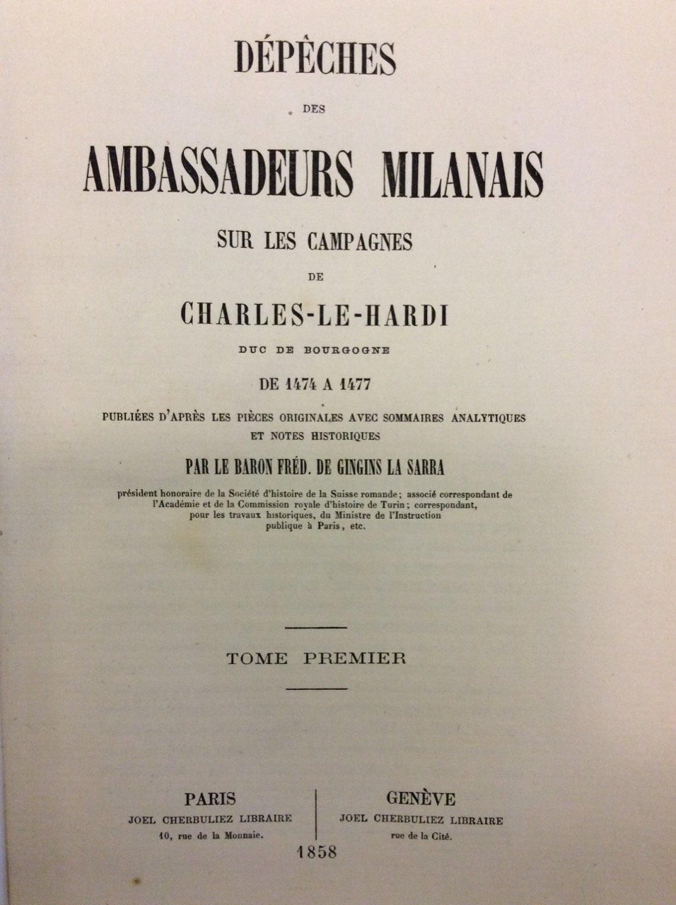 DEPECHES DES AMBASSADEURS MILANAIS SUR LES CAMPAGNES DE CHARLES-LE-HARDI DUC DE BOURGOGNE, DE 1474 A 1477. - Publiées d'après les pièces originales avec sommaires analytiques et notes historiques.