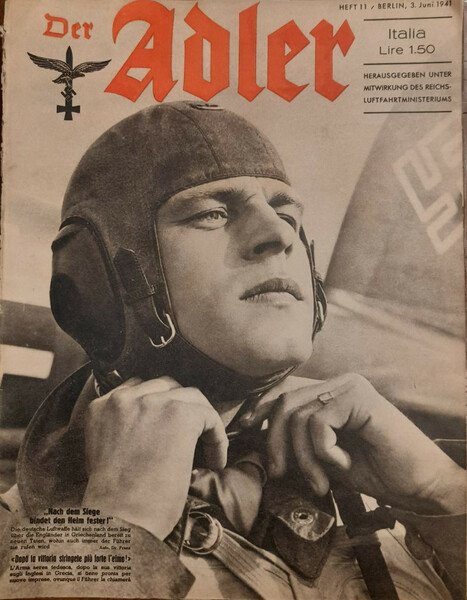 RIVISTA A CURA DEL MINISTERO GERMANICO DELL'AERONAUTICA. Testo in tedesco e italiano. Disponibili i seguenti numeri: Anno 1941: n. 11 del 3 giugno; n. 13 del 1 luglio; n. 15 del 29 luglio; n. 10 del 12 agosto. Anno 1942: n.11 del 2 giugno, seguono i numeri 12/13/14/16/17/19/20/21/22/23/24/26 che è l'ultimo numero del 29 dicembre. 17 fascicoli in 4to, di 30 pagine ciascuno, con iilustrazioni fotografiche. Normali segni del tempo, 2/3 pagine staccate da un paio di fascicoli, ma il tutto è completo. Il lotto era legato probabilmente in origine tutto insieme, e successivamente slegato. Codice inv.1031244