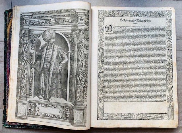 Prima edizione in lingua tedesca. Completa del frontespizio inciso e delle 125 tavole incise a bulino eseguite dall'incisore-editore Dominicus Custos (Anversa 1560 ca.- Augusta 1612) sui disegni di G. B. Fontana, una è attribuita a Georg Pencz. I condottieri vengono ritratti come fossero statue, in una nicchia, entro colonne adorne di putti ed elementi vegetali. Sulla base sporgente delle colonne ricorrono motivi decorativi, mentre al di sotto del ritratto è inserita una tabella rettangolare con cornice ornamentale, affiancata da due putti, destinata ad accogliere il nome del personaggio effigiato.