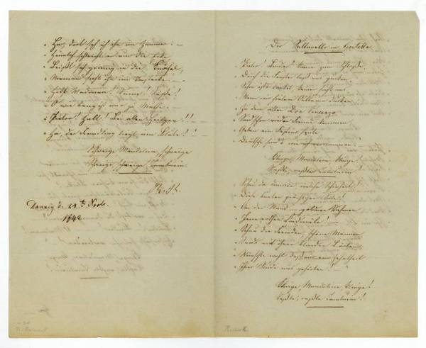 2¾ SS. auf Doppelblatt. 8vo. Pietro! Bruder! komm zum Schloße | Durch die Fenster laß uns gucken, | Schon ist's dunkel, keiner sieht uns, | Wenn wir hinterm Oelbaum ducken. | Zu dem alten Don Vincenzo | Sind schon wieder Fremde kommen, | Geben ein Festino heute, | Deutsche sind's, wie ich vernommen [.].