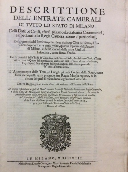 In-4 gr. (mm. 342x225), cartonato rustico coevo (con aloni), pp. (4),331. Vi sono descritte anche: della quantità del perticato che rileva ciascuna città del Stato, il suo contado e le terre tanto unite quanto separate del Ducato di Milano e delli contadi delle altre città, sì infeudate come senza feudo. E della quantità delle tasse de' cavalli e delli stara di sale, che ciascuna città e terra rileva.. E l'annotamento delle terre e luoghi, sì nelli confini dello Stato come fuori d'esso, nelle quali pretende Sua Regia Maestà ragione & in alcune de' quali si riscuodono le gravezze camerali. Di nuovo ristampato.. con havervi aggiunto li fondi camerali alienati.. con il sommario del perticato generale dello Stato di Milano secondo le misure fatte dell'anno 1531 e 1549 e la misura del perticato civile della città e Ducato di Milano. Cfr. Predari, p. 599.Esemplare con barbe, ben conservato.