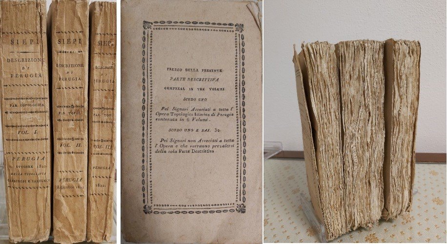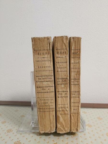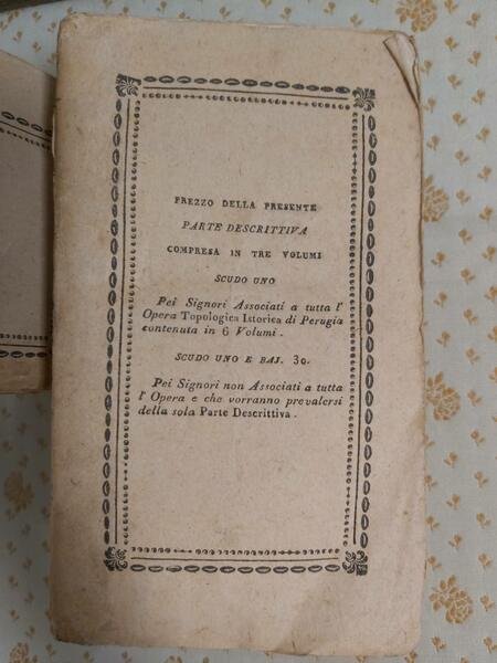 3 voll. in-16, pp. (4), 956, XXVII, (4) (numerazione continua), bross. edit. con cop. xilogr. Il seguito dell’opera che doveva interessare la parte storica non fu mai pubblicato. Vermiglioli II, 920. Lozzi 3474. Manca a Cat. Hoepli. Raro. Ex libris. Ottimo esempl. [182]