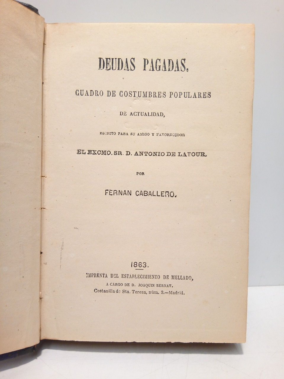Deudas pagadas: Cuadros de costumbres populares de actualidad. Escrito para su amigo y favorecedor el Excmo. Sr. D. Antonio de Latour, por. / Prólogo (XXXVII pags.) por Manuel Cañete
