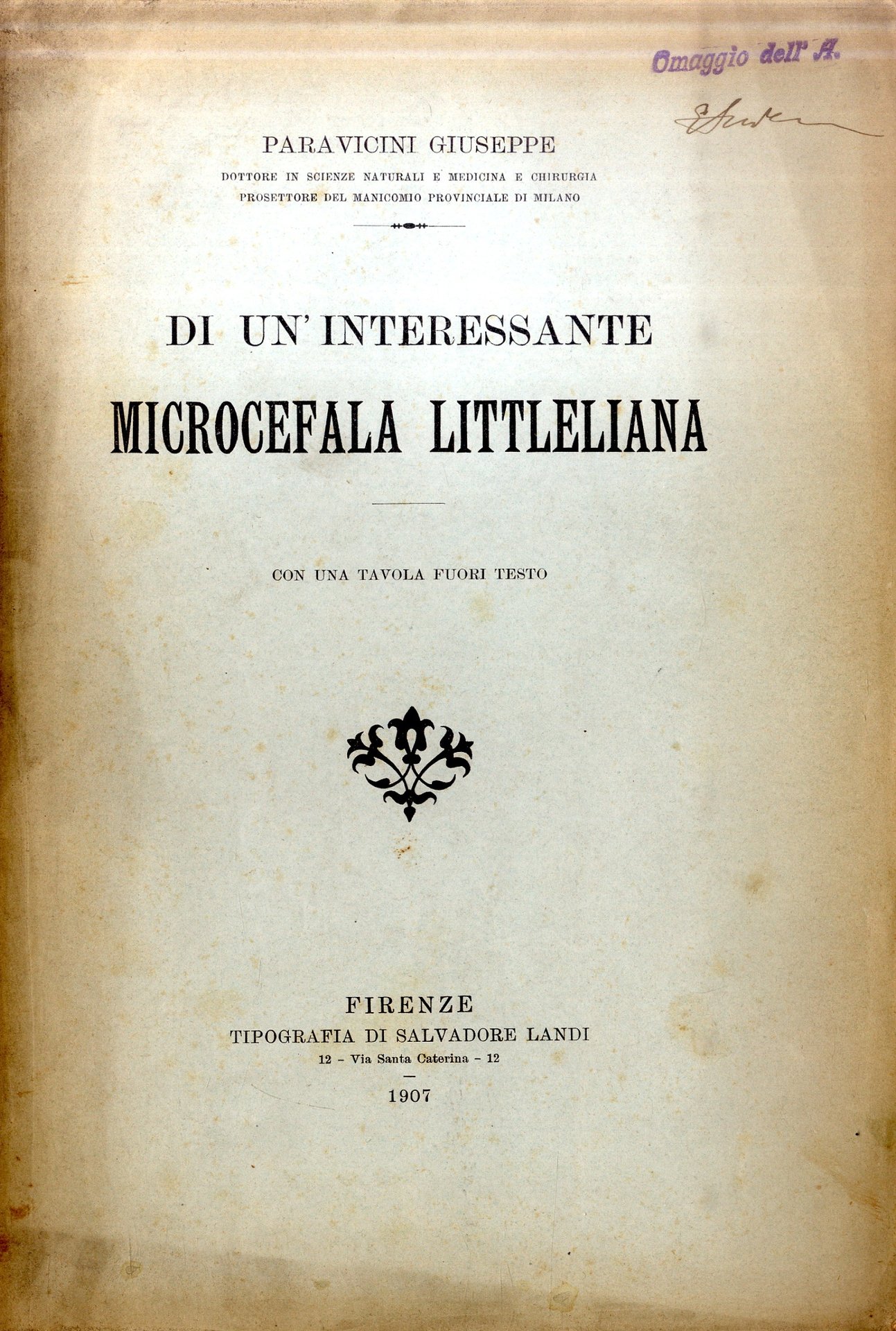 >in-8 (240x180 mm), pp. 177 con una tavola e alcuni grafici. Brossura editoriale (dorso restaurato). L'autore, il torinese Giuseppe Paravicini (1871-1927), ricoprì la carica di anatomista presso l'Istituto di Anatomia Patologica del più grande manicomio d'Italia, a Mombello di Limbiate, dal 1901 al 1917, e dal 1910 al 1917 fu appuntato direttore del suddetto nosocomio. Buon esemplare, con invio autografo dell'A. al piatto anteriore.