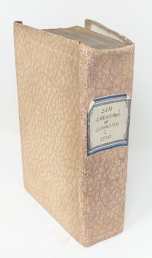 >in-8 (mm. 159x105), ff (8), 180, (1); leg. ottocentesca in cartonato con unghie, titolo ms. al dorso su tassello cartaceo. Sotto il breve titolo, lo stemma degli Sforza in silografia, su fondo nero con lieve colorazione marrone chiaro. Gregorio I fu il primo monaco ad essere eletto Papa (590-604), importante sostenitore della visione monastica di San Benedetto così come un fervente promotore della sua Regola. Padre della Chiesa, fu proclamato Santo anche dalla Chiesa Ortodossa. I suoi Dialoghi raccolgono una serie di libri sulla vita di Santi italiani, abati, diaconi, suore, vescovi e sugli aspetti della vita dopo la morte (paradiso, inferno e purgatorio). L'opera vide la luce a Pesaro nella bottega di Hieronymo Soncino. E' certo che “in casa di Aldo egli si sia perfezionato nell'arte della stampa, perché la prima volta che il suo nome compare nel colofone di un'opera - il De situ orbis di Pomponio Mela, uscito a Pesaro "per Petrum Capha, in domo Hieronymi Soncini, 1510, die IX Februarii" - si mostra provetto tipografo” (Diz. Biogr. Treccani).