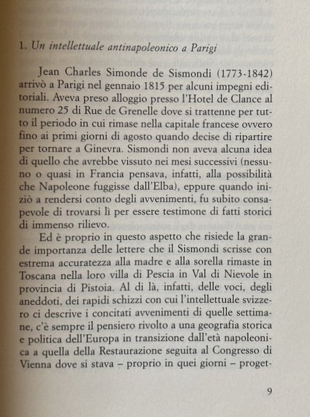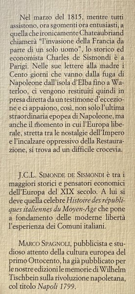 Nel marzo del 1815, mentre tutti assistono, ora sgomenti ora entusiasti, a quella che ironicamente Chateaubriand chiamerà "l'invasione della Francia da parte di un solo uomo", lo storico ed economista Charles de Sismondi è a Parigi. Nelle sue lettere alla madre i Cento giorni che vanno dalla fuga di Napoleone dall'isola d'Elba fino a Waterloo, ci vengono restituiti quindi in presa diretta da un testimone d'eccezione e ci appaiono, così, non solo l'ultima straordinaria epopea di Napoleone, ma anche il momento in cui l'Europa liberale, stretta tra le nostalgie dell'Impero e l'incalzare oppressivo della Restaurazione, si trova ad un difficile crocevia.