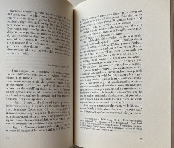 Soggetti: Biografie, Autobiografie, Personaggi storici, politici e militari, Napoleone Bonaparte, Storia moderna, Diario, Memorie, Settecento, Ottocento, Francia, Epistolario, Corrispondenza, Lettere, Politik, Staatstheorie, Elba, Sant'Elena, Rivoluzione francese, Cento giorni, Esilio, Guerre napoleoniche, Politica, Storiografia, Testimonianze, Resoconti di guerra, Intellettuali antinapoleonici, Restaurazione, Congresso di Vienna, Consultazione, Bibliografia, Studi culturali, Simondo Sismondi, Madame de Staël, Battaglia di Waterloo, Svizzera, Libertà, Fragments, Journal, Correspondance, Lettres inédites, Italia, Bibliografia, Impero, Benjamin Constant, Ascesa, Caduta, Luigi XVIII, Borboni, Santa Alleanza, Sconfitta, Campagne, Conquiste, Esercito napoleonico, Costituzione, Giacobini, Privilegi, Vandea, Repubblica, MacIntosh, Inghilterra, Santorre di Santarosa, Cavour, Ugo Foscolo, Vincenzo Monti, David Ricardo, Circoli culturali, Pescia, Giorgio Spini, Marxismo, Socialismo, Utopia, Utopisti, Jessie Allen, Gioacchino Murat, Napoli, Monitore Napoletano, Repubblica Partenopea, Tuileries, Madame Béranger, Saggi storici, Libri Vintage Fuori catalogo, Biographies, Autobiographies, Historical, political and military figures, Napoleon Bonaparte, Modern history, Diary, Memories, Eighteenth century, Nineteenth century, France, Letters, Correspondence, Letters, Saint Helena, French Revolution, Hundred Days, Exile, Napoleonic Wars, Politics, Historiography, Testimonies, War reports, Anti-Napoleonic intellectuals, Restoration, Consultation, Bibliography, Cultural studies, Battles, Switzerland, Freedom, Fragments, Journal, Correspondance, Italy, Bibliography, Empire , Benjamin Constant, Rise, Fall, Louis XVIII, Bourbons, Holy Alliance, Defeat, Campaigns, Conquests, Napoleonic army, Constitution, Jacobins, Privileges, Vendée, Republic, England, Cultural circles, Marxism, Socialism, Naples, Neapolitan Monitor, Neapolitan Republic, Historical essays, Out of print books