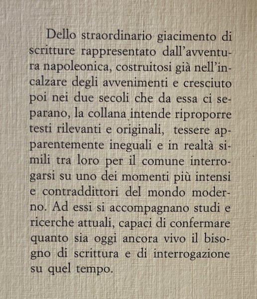 Dello straordinario giacimento di scritture rappresentato dall'avventura napoleonica, costruitosi già nell'incalzare degli avvenimenti e cresciuto poi nei due secoli che da essa ci separano, la collana intende riproporre testi rilevanti e originali, tessere apparentemente ineguali e in realtà simili tra loro per il comune interrogarsi su uno dei momenti più intensi e contraddittori del mondo moderno. Ad essi si accompagnano studi e ricerche attuali, capaci di confermare quanto sia oggi ancora vivo il bisogno di scrittura e di interrogazione su quel tempo.