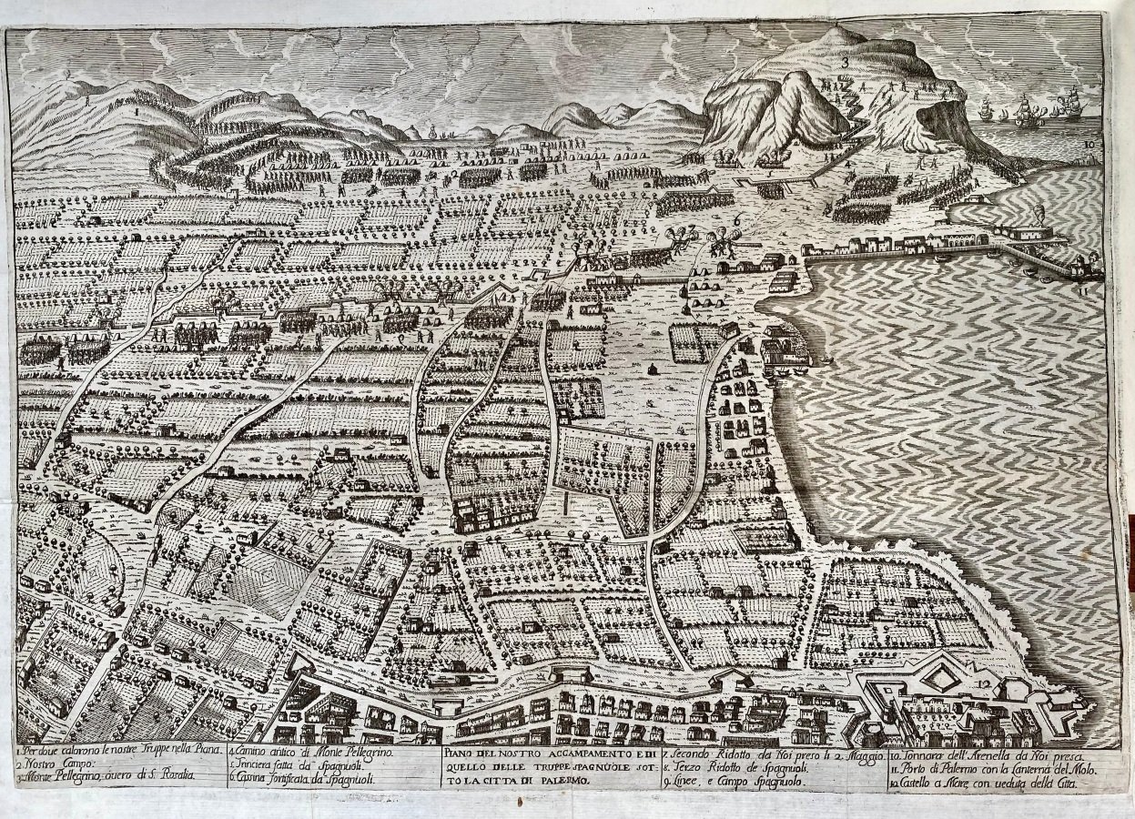 2 parti in 1 volume in-4° (cm. 18,8), legatura in piena pergamena coeva semifloscia (con integrazione al dorso e titolo manoscritto, lievi segni d'uso); pp. [4] 112, [2] 240 [2] in stato molto buono, con 3 grandi tavole incise in rame e ripiegate fuori testo raffiguranti la battaglia di Francavilla, l'assedio di Messina e gli accampamenti delle truppe all'Arenella nei pressi di Palermo (poche riparazioni sul retro); antica nota di appartenenza al contropiatto di Bartolomeo Prasca (Finale Ligure). Edizione originale della rara opera storica sulla guerra tra Spagna e Francia all'indomani del Trattato di Utrecht, mentre nella seconda parte sono analizzati gli avvenimenti e gli effetti della cacciata degli Spagnoli da Messina. Cfr. Lozzi 5016; Mira I, 296; Melzi I, 294 (per il nome dell'autore e il luogo di stampa). Buon esemplare. (SH4)