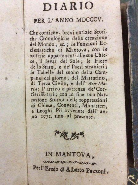 DIARIO PER L'ANNO MDCCCV (1805). - Che contiene, brevi notizie storiche cronologiche della creazione del mondo, ec., le funzioni ecclesiastiche di Mantova, con le notize appartenenti alle sue chiese....