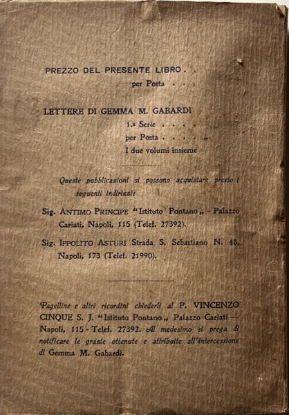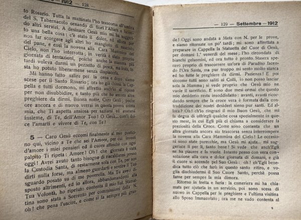 Soggetti: Biografie, Diari, Memorie, Pia Unione delle piccole Ancelle del Sacro Cuore, Gesuiti, Compagnia di Gesù, Meta di Sorrento, Esercizi spirituali, Devozione, Devote, Religione, Cristianesimo, Vita religiosa, Missionarie, Storia di genere, Donne, Religiose, Lettere, Carteggi, Epistolario, Libri Vintage Fuori catalogo, Collezionismo, Da collezione, Anni Trenta, Diario spirituale, Esercizi spirituali, Ritiro, Spiritualità, Fede, Novecento, Madonna di Pompei, Aristocrazia, Nobiltà, Calvario, Educazione religiosa, Donne venerabili, Preghiera, Rosario, Storie vere, Mistiche, Mistica, Maria Guerrini, Famiglie illustri, Biographies, Diaries, Memories, Pious Union of the Little Handmaids of the Sacred Heart, Jesuits, Company of Jesus, Spiritual Exercises, Devotion, Devotees, Religion, Christianity, Religious life, Missionaries, Gender history, Women, Religious, Letters, Correspondence, Letters, Out of print books, Collectables, Collectible, Thirties, Spiritual diary, Spiritual exercises, Retreat, Spirituality, Faith, Twentieth century, Pompeii, Aristocracy, Nobility, Calvary, Religious education, Venerable women, Prayer, Rosary, True stories, Mystics, illustrious families
