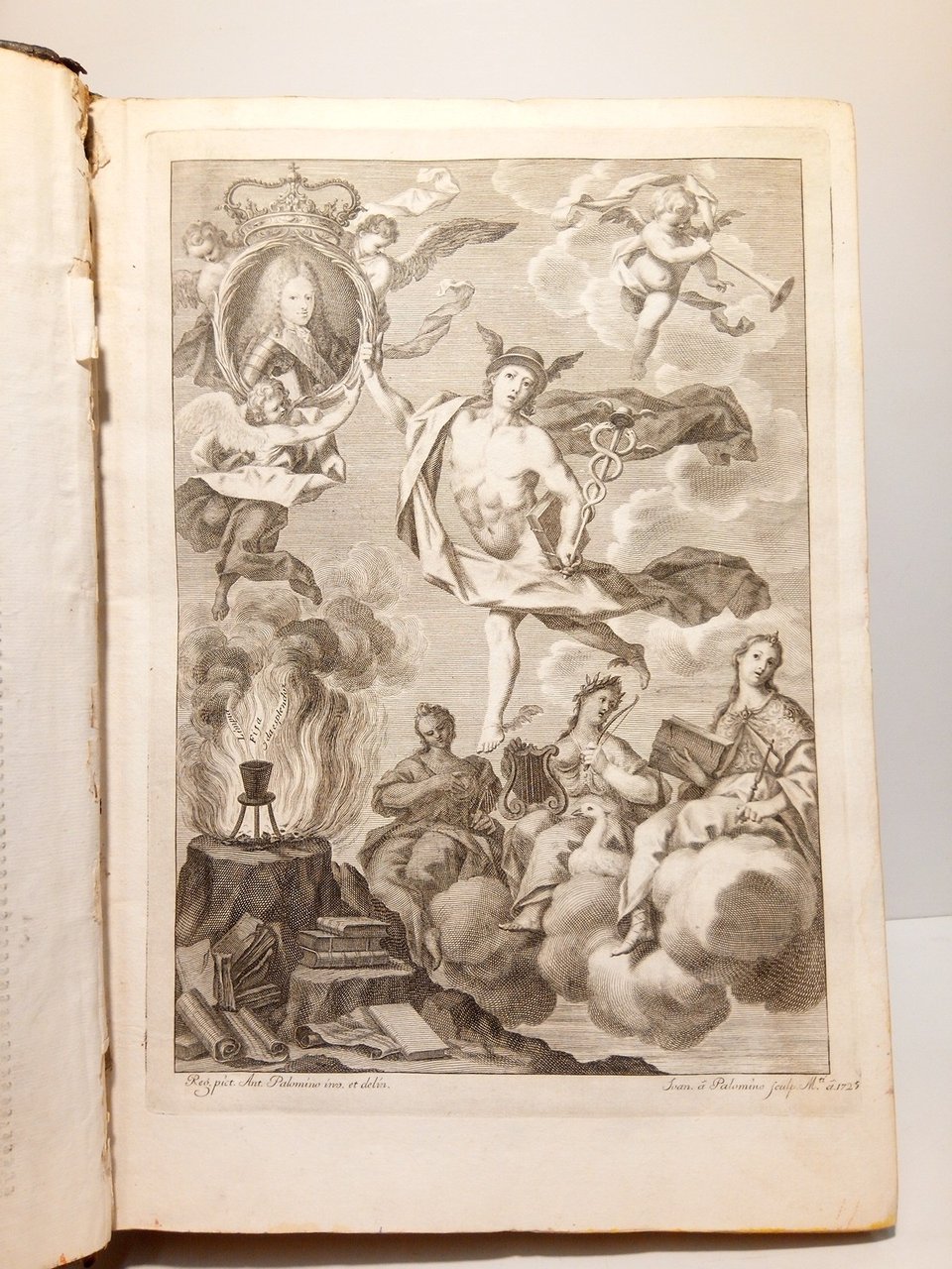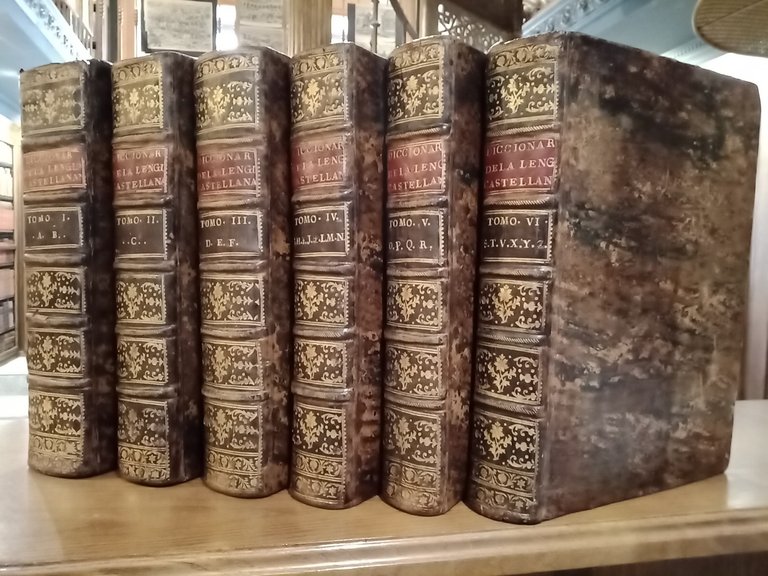 [PRIMERA EDICION COMPLETA EN 6 TOMOS].- Con Privilegio. En Madrid: [los tomos 1º a 5º] En La Imprenta de Francisco del Hierro, Impresor de la R. Academia Española, 1726 - 1729 - 1732 - 1734 - 1737 y [el tomo 6º] en la Imp. de la Real Academia Española, por los Herederos de Francisco de el [del] Hierro, 1739.- En conjunto 6 VOLS. con: Tomo 1º. [4 h.], sigue grabado alegórico al cobre, LXXXXVI, 723 p / Tomo 2º. [6 h.], 714 p. / Tomo 3º. [6 h.], 816 p. / Tomo 4º. [6 h.], 696 p. / Tomo 5º. [6 h.], 656 p. / Tomo 6º. [18 h.], 578 p.: Tras la portada del Tomo 1º, tal y como se ha indicado, lleva un bello grabado a pleno folio dibujado por Antonio Palomino y grabado al cobre por Joan á Palomino; Magnífica impresión a dos columnas sobre gran papel de hilo verjurado; Con bonitas letras capitales grabadas en madera y cul-de-lampe al final de cada letra; Gran Folio (34,3 x 25 cm); Enc. en Plena Piel Pasta de la época, lomo cuajado en oro, tejuelo rojo, cortes jaspeados en tonos rojo y azul, incluyendo en cada tomo un precioso escudo nobiliario grabado a modo de ex-libris perteneciente al Marqués de Grimaldo, Ministro de Felipe V.- PALAU N.º 1286.* En excelente estado general. Tan solo algunas esquinas y bordes de la encuadernación han sido reparados de los normales desgastes del tiempo, apreciándose pequeñas faltas en las cejillas de las cabezas de los lomos en los tomos 1 y 6. Interior en perfecto estado, con el papel firme, blanco, sin manchas ni otros defectos. Publicado entre 1726 y 1739, el Diccionario de la lengua castellana de la Real Academia Española (conocido como Diccionario de Autoridades) representa la primera gran empresa lexicográfica del español. Concebido con fines normativos, reunió definiciones apoyadas en ejemplos de autores canónicos, sentando así las bases de la tradición académica. Su método, basado en el uso ilustrado, buscaba fijar la lengua sin desligarla de su riqueza histórica y literaria. Fue una obra clave en la consolidación de una lengua culta unificada para el mundo hispánico. Se estima que la tirada total fue de aproximadamente 1.500 ejemplares distribuidos en seis tomos. Hoy en día resulta una obra dificilísima de conseguir. LENGUA ESPAÑOLA