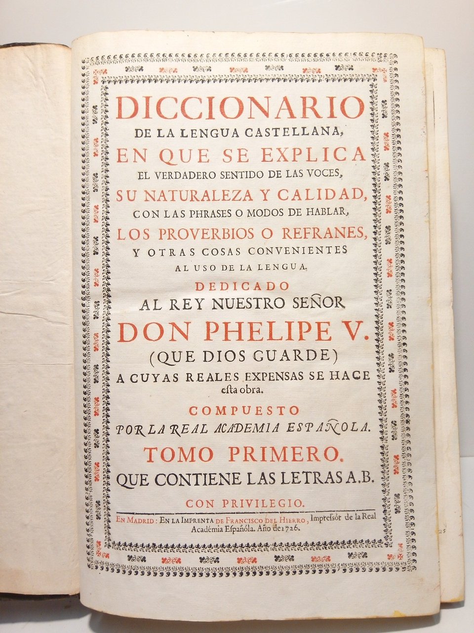 Diccionario de la lengua castellana, en que se explica el verdadero sentido de las voces, su naturaleza y calidad,con las phrases o modos de hablar, los proverbios o refranes, y otras cosas convenientes al uso de la lengua [conocido como Diccionario de Autoridades]. Dedicado al Rey Nuestro Señor Don Phelipe V. (que Dios guarde) a cuyas reales expensas se hace esta obra / Compuesto por la Real Academia Española