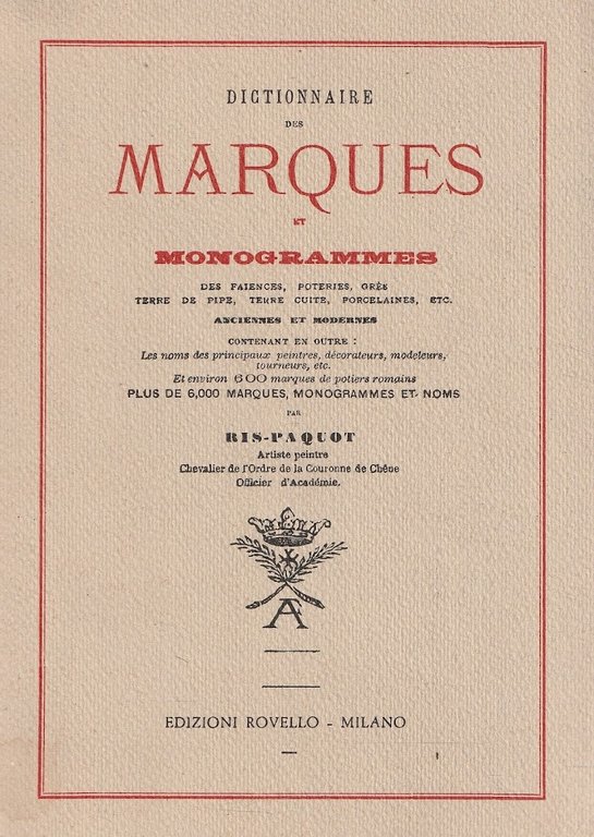 Dictionnaire des marques et monogrammes des faiences, potèries, gres, terre de pipe, terre cuite, porcelaines, etc.