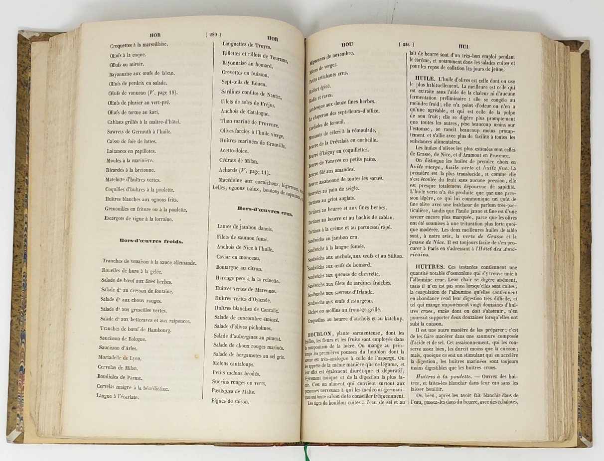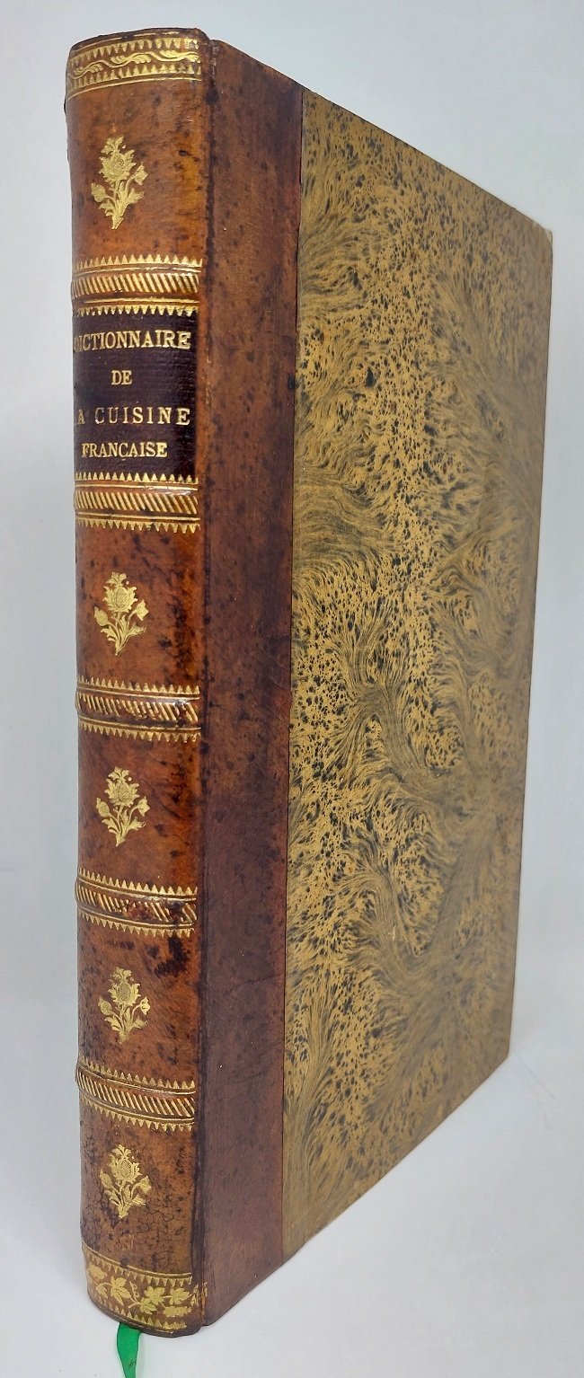 >in-8, pp. 635, testo su due colonne. Legatura coeva in m. pelle, dorso a nervi con fregi e titolo oro, piatti e sguardie in carta marmorizzata. Vasta e dettagliata visione della gastronomia di Francia nei secoli. Bell'esemplare. Bitting p.104.