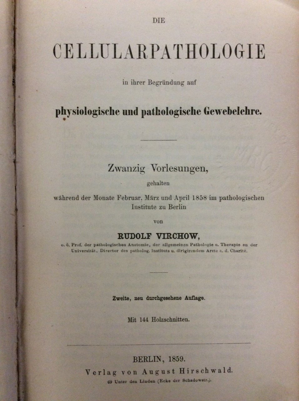 DIE CELLULARPATHOLOGIE IN IHRER BEGRÜNDUNG AUF PHYSIOLOGISCHE UND PATHOLOGISCHE GEWEBELEHRE. - Zwanzig Vorlesungen gehalten während der Monate Februar, März, April 1858 im pathologischen Institute zu Berlin. Zweite, neu durchgesehene Auflage.