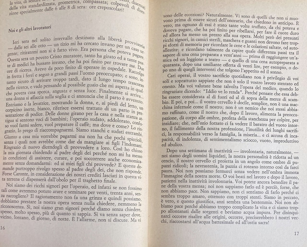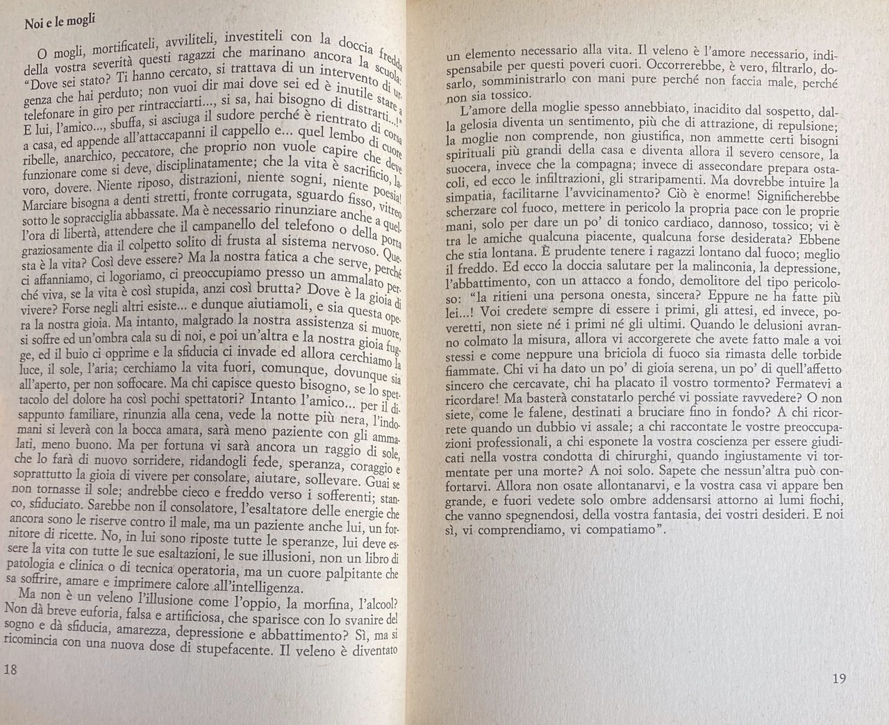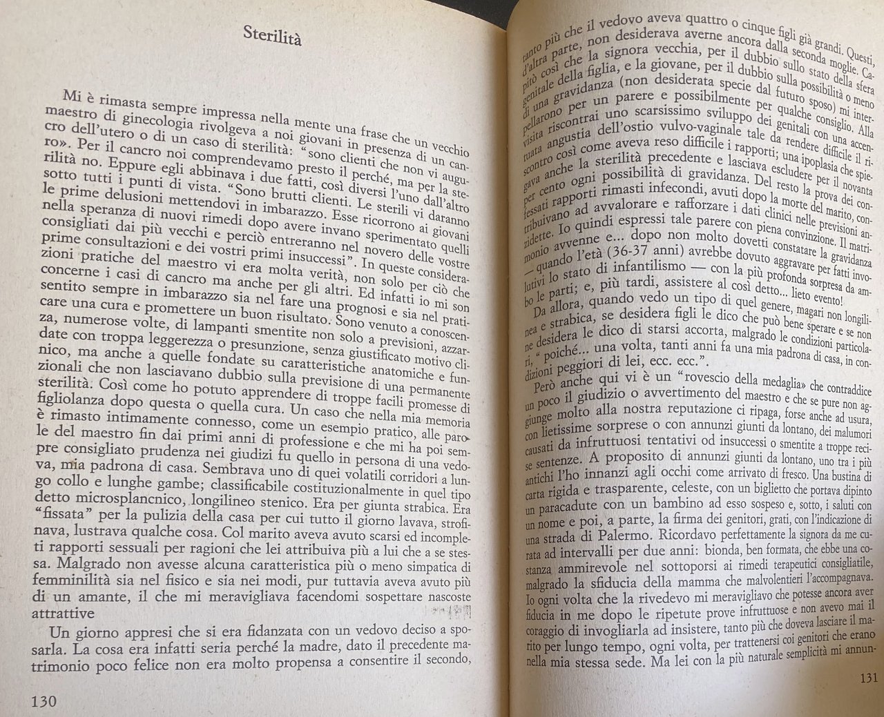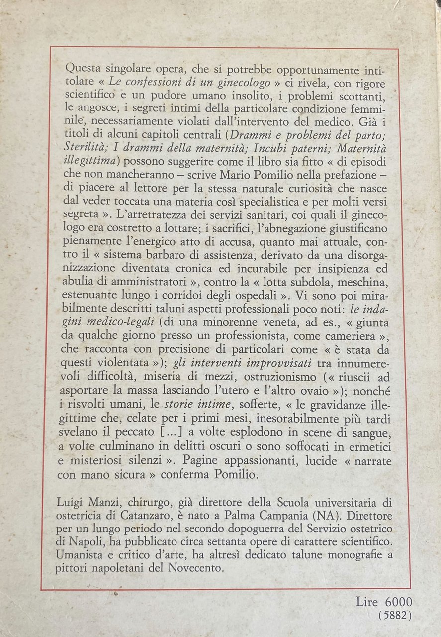 Questa singolare opera, che si potrebbe opportunamente intitolare «Le confessioni di un ginecologo» ci rivela, con rigore scientifico e un pudore umano insolito, i problemi scottanti, le angosce, i segreti intimi della particolare condizione femminile, necessariamente violati dall'intervento del medico. Già i titoli di alcuni capitoli centrali (Drammi e problemi del parto; Sterilità; I drammi della maternità; Incubi paterni; Maternità illegittima) possono suggerire come il libro sia fitto «di episodi che non mancheranno - scrive Mario Pomilio nella prefazione - di piacere al lettore per la stessa naturale curiosità che nasce dal veder toccata una materia così specialistica e per molti versi segreta». L'arretratezza dei servizi sanitari, coi quali il ginecologo era costretto a lottare; i sacrifici, l'abnegazione giustificano pienamente l'energico atto di accusa, quanto mai attuale, contro il «sistema barbaro di assistenza, derivato da una disorganizzazione diventata cronica ed incurabile per insipienza ed abulia di amministratori», contro la «lotta subdola, meschina, estenuante lungo i corridoi degli ospedali». Vi sono poi mirabilmente descritti taluni aspetti professionali poco noti: le indagini medico-legali (di una minorenne veneta, ad es., «giunta da qualche giorno presso un professionista, come cameriera», che racconta con precisione di particolari come «è stata da questi violentata»); gli interventi improvvisati tra innumerevoli difficoltà, miseria di mezzi, ostruzionismo («riuscii ad asportare la massa lasciando l'utero e l'altro ovaio»); nonché i risvolti umani, le storie intime, sofferte, «le gravidanze illegittime che, celate per i primi mesi, inesorabilmente più tardi svelano il peccato [.] a volte esplodono in scene di sangue, a volte culminano in delitti oscuri o sono soffocati in ermetici e misteriosi silenzi». Pagine appassionanti, lucide «narrate con mano sicura» conferma Pomilio.