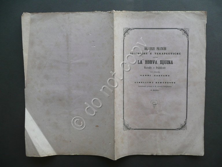 Gaddi Gaetano - Gibellini Benedetto, Diligenze pratiche igieniche e terapeutiche contro la Morva Equina Raccolte e pubblicate dai Zoojatri Gaddi Gaetano e Gibellini Benedetto Assistenti presso la R. Scuola Zoojatrica di Modena Tipografia degli Eredi Soliani, Modena 1864, cm 22x14,5, pp. 16, brossura ed. Condizioni di conservazione Esemplare in buone condizioni con tracce d'uso, lieve traccia di piega longitudinale, brossure con leggeri aloni, due angoli della br. post. con tracce di pieghe, cuffia sup. con un minimo danno da roditore che non interessa il testo. Interni buoni con poche minime bruniture al frontespizio e all'ultima pagina. SC03.D9852 N