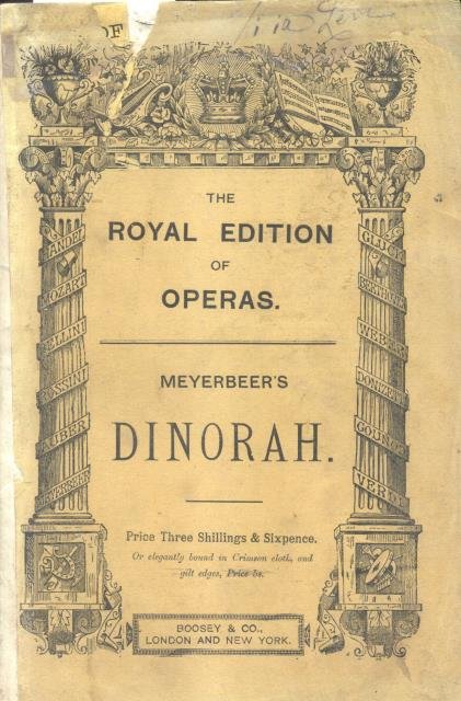 Testo inglese-italiano. 8°,pg.(4),284. Restauro cartaceo al dorso, piatto anteriore staccato. "Dinorah" è il titolo dell'opera comica "Le pardon de Ploermel" per le rappresentazioni fuori Parigi. Codice libreria 40216.
