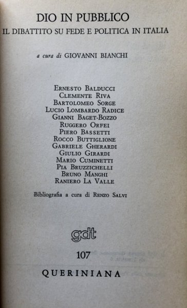 DIO IN PUBBLICO. IL DIBATTITO SU FEDE E POLITICA IN ITALIA. A CURA DI GIOVANNI BIANCHI | Libros antiguos y modernos | Ernesto Balducci, Clemente Riva, Bartolomeo Sorge, Lucio Lombard, O Radice, Gianni Baget-Bozzo, Ruggero Orfei, Piero Basseti, Rocc, O Buttiglione, Gabriele Gherardi, Giulio Girardi, Mario Cuminett, I, Pia Bruzzichelli, Bruno Manghi, Raniero La Valle
