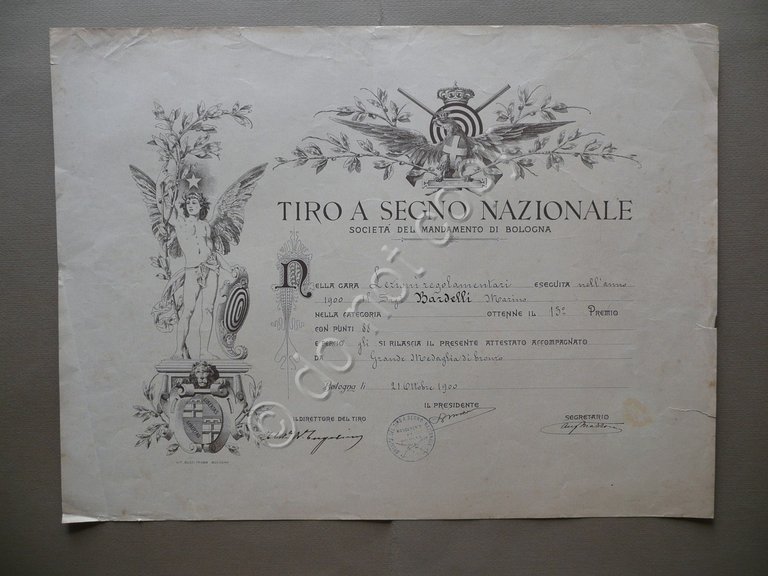 Diploma, Tiro a Segno Nazionale Società del Mandamento di Bologna Bologna, 21 ottobre 1900 Lit- Succ. Thumb, Bologna 1900, grande diploma a stampa su carta, sezioni bianche compilate manualmente, presenza di timbro e firme che ne certificano la validità e di due bei fregi in monocromia. Cm 37x49,5. Condizioni di conservazione Esemplare in buone condizioni con alcune piccole lievissime bruniture, margini e angoli con minimi strappetti (presenza di un paio di strappetti di qualche cm) e alcune lievi tracce di pieghe. SC03.D9543 N F extra
