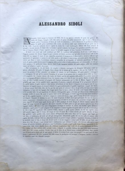 Alessandro Sidoli, eclettico architetto, pittore e artista grafico. Nacque a Cremona, Regno d'Italia, il 30 luglio 1812; d. Milano, Lombardo-Veneto (Milano, Italia), e morì il 21 luglio 1855. Per la sua precoce attitudine fu posto dai genitori allo studio del disegno. Compite le prime discipline ornamentali, egli si recò a Milano e seguitò, presso l'accademia di Brera, gli studi di architettura. Col disegno di un grandioso mausoleo uscì vincitore del Concorso Giuseppe Girotti per il disegno architettonico, e ottenne la medaglia maggiore al Gran Concorso di Architettura.