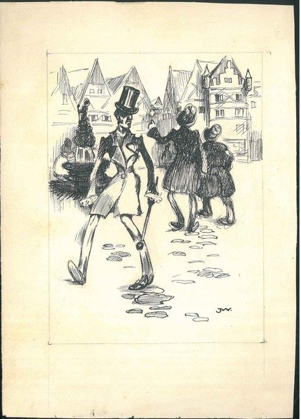<p>21,5x15 cm disegno caricaturale a china su carta forte di passeggio in una via di Praga firmato J.W. Inizio 1900</p>