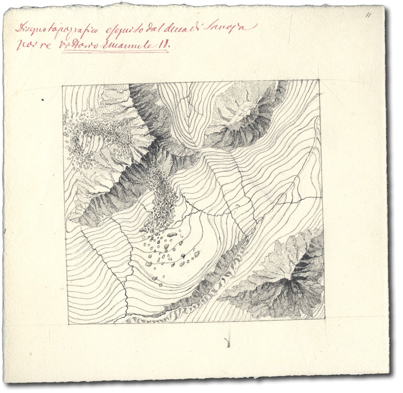 >mm 165x160 (disegno mm110x105), disegno topografico a china e matita su cartoncino. Una nota manoscritta in inchiostro rosso sul margine superiore attribuisce il disegno a Emanuele II di Savoia ''Disegno topografico eseguito dal Duca di Savoia poi Re Vittorio Emanuele II''. La mappa rileva una porzione di territorio montuoso solcato da corsi d'acqua. L'esecuzione di disegni topografici faceva parte dell'istruzione dei gentiluomini indirizzati alla carriera militare. Vittorio Emanuele II fu Re di Sardegna dal 1848, anno dell'abdicazione di Carlo Alberto, e dal 1861 primo Re d'Italia.