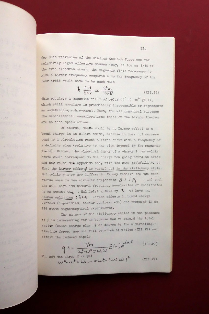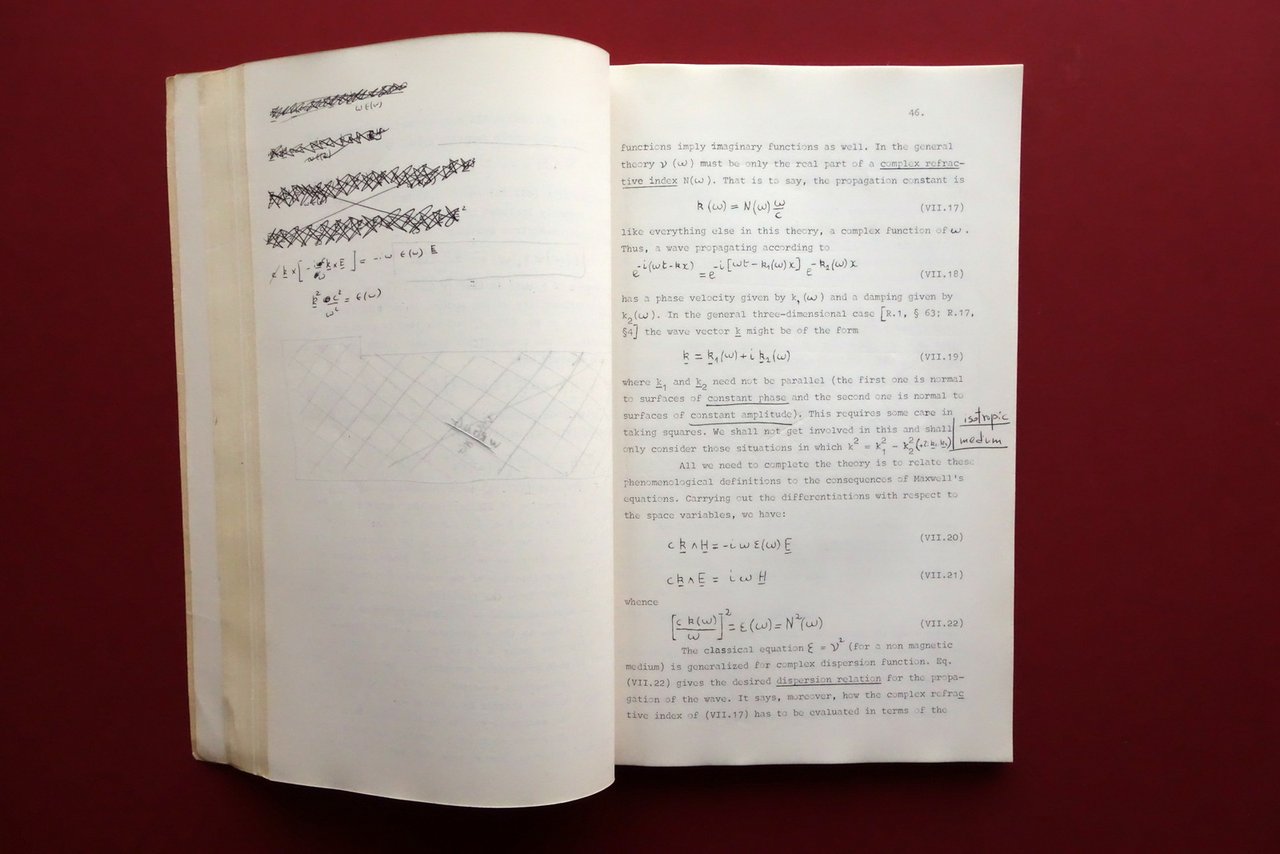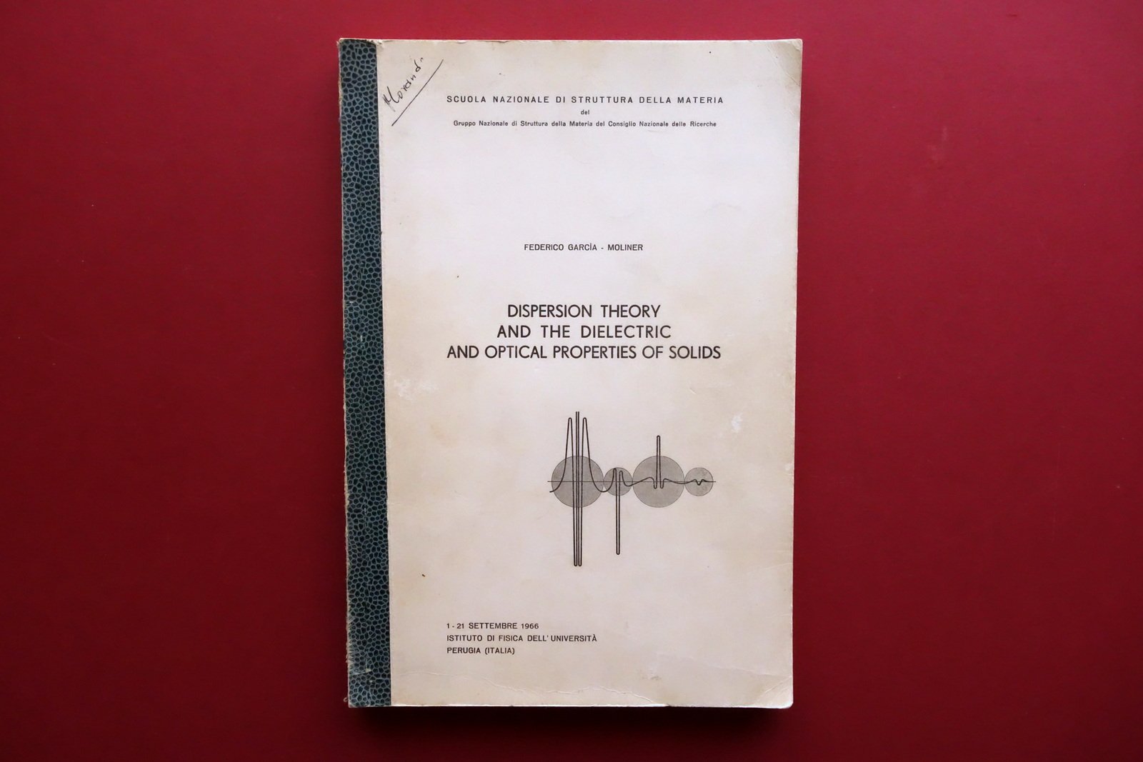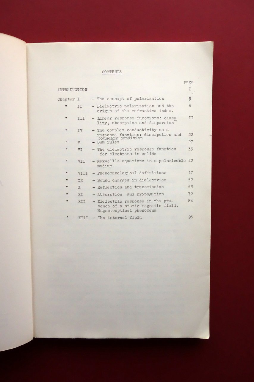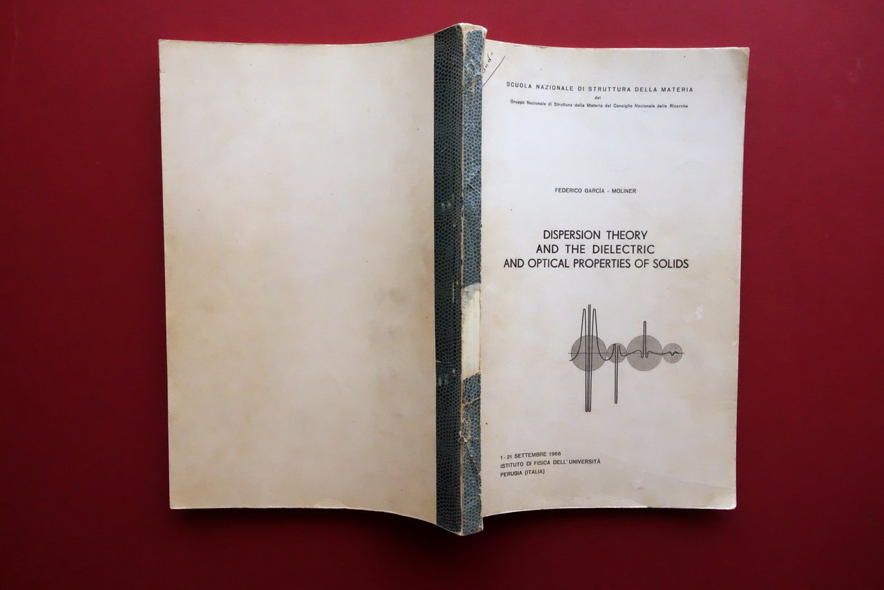 Scuola Nazionale di Struttura della Materia del Gruppo Nazionale di Struttura della Materia del Consiglio Nazionale delle Ricerche, Federico Garcia - Moliner, Dispersion Theory and the Dielectric and Optical Properties of Solids - 1 - 21 settembre 1966 Istituto di Fisica dell'Università di Perugia Università di Perugia - Istituto di Fisica, 1966; cm 31,5x21,5; pp. 114 più 5 fig. al termine del testo (le figure non sono in ordine progressivo); stampa tipo ciclostilato. Cartoncino ed. con titolo al piatto anteriore. Nome del precedente proprietario annotato a penna. Testo in inglese. Condizioni di conservazione Condizioni complessivamente buone con tracce d'uso, cartoncino ed. con minimi leggerissimi aloni e accenni di sporco, dorso con mancanze e strappetti ma restaurato mediante l'applicazione di collante, esemplare compatto. Interni buoni; varie pagine con sottolineature, note e/o segnetti a penna nera. Tavole leggermente ingiallite ai margini. SETT227.L27329 N
