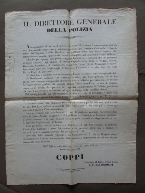 Disposizioni Polizia Feste Maschera Ordine Pubblico Soliani Modena 1857